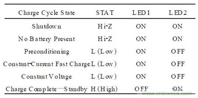 表1:MCP73831 电路设计中指示灯的逻辑关系