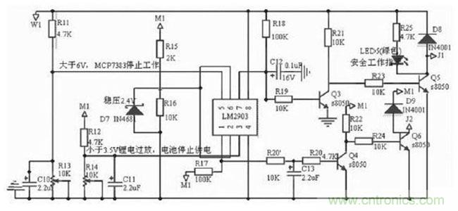 当锂电池电压低于315V 时,即电池电量释放92%以上时,认为不能继续放电,否则锂电池内部介质会发生变化,致使充电特性变坏,容量降低等。为此设计过放电?;た刂频缏?,此电路的具体设计如图3,分析如下:采用了LM 2903的1,2,3 脚组成的一路比较器,与外围器件构成过放电压比较器,R12 , R14分压后接至LM 2093 的3 脚。当电压值小于315V 时,分压值小于214V,LM 2903的1 脚由高电平转变为低电平, Q4 由导通转变为截止状态, Q6 饱和导通,JDQ2 工作,同时过放红色指示灯亮。