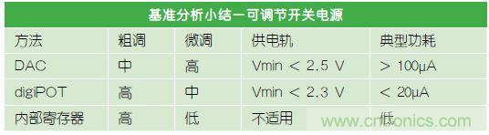 控制误差放大器引脚电压,便可调整输出电压。这可以通过使用DAC,或者使用数字电位计,以外部方式实现,如图2所示。某些电压调节器允许使用串行接口(比如PMBus、I2C或SPI)在内部控制反馈电压。表1比较了三种方法的调整能力和功耗。