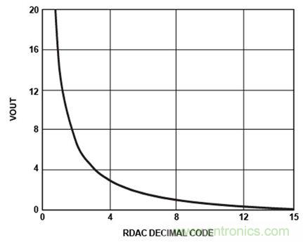 以RAW和RWB代替R1和R2可实现对数传递函数。数字码和输出电压之间的非线性关系降低了低端分辨率。图5显示了这个取自数字电位计的对数传递函数。