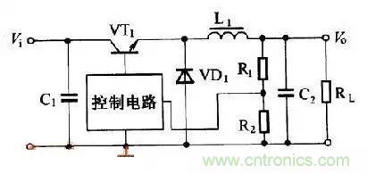 DC-DC就是直流-直流变换,一般有升压(BOOST)、降压(BUCK型)两种。降压式DC/DC变换器的输出电流较大,多为数百毫安至几安,因此适用于输出电流较大的场合。降压式DC/DC变换器基本工作原理电路如下图所示。VT1为开关管,当VT1导通时,输入电压Vi通过电感L1向负载RL供电,与此同时也向电容C2充电。在这个过程中,电容C2及电感L1中储存能量。当VT1截止时,由储存在电感L1中的能量继续向RL供电,当输出电压要下降时,电容C2中的能量也向RL放电,维持输出电压不变。二极管VD1为续流二极管,以便构成电路回路。输出的电压Vo经R1和R2组成的分压器分压,把输出电压的信号反馈至控制电路,由控制电路来控制开关管的导通及截止时间,使输出电压保持不变。