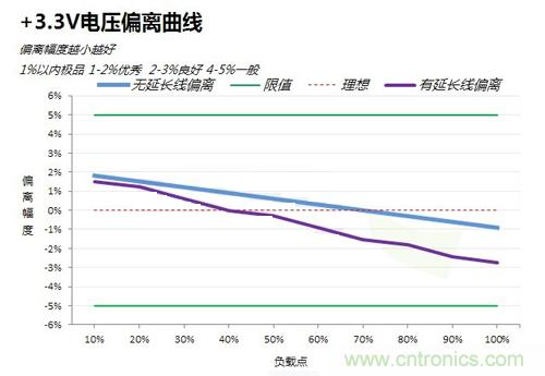 然后看下电源电压偏离对比,可以发现在加入了延长线之后,电源的电压也有一定程度的影响。其中+12V影响较大,+5V和+3.3V影响较小。