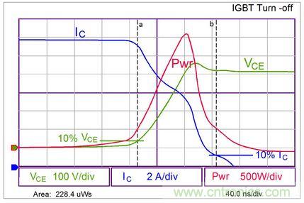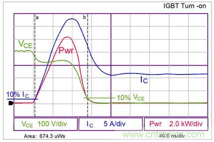 导通时,应当量测起于IC电平10%终于10% VCE点的损耗。这些电平等级相当标准,虽然这样说也有些主观性。如果需要的话,也可以使用其他点。无论选择何种电平来量测不同间隔,重要的是保持一致,使从不同 组件获取的数据能够根据相同的条件来比较。功率根据示波器波形来计算。由于它并非恒定不变,且要求平均功率,就必须计算电源波形的积分,如波形迹线的底部 所示,本案例中为674.3 μW(或焦耳)。