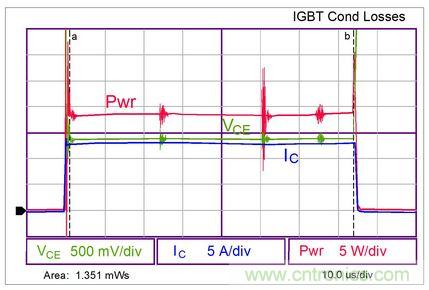 导电损耗的量测方式类似。它们应当起于导通损耗终点,终于关闭损耗起点。这可能难于精确量测,因为导电损耗的时间刻度远大于开关损耗。