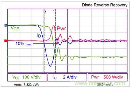 一般而言,在电压波形的峰值,IGBT将导电,而二极管不导电。为了量测二极管损耗,要求像电机这样的无功负载,且需要捕获电流处于无功状态(如被馈送回电源)时的波形。