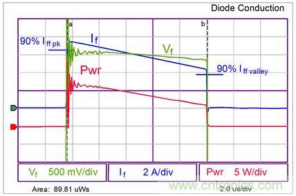 必须获取在开关周期的部分时段(此时电流为无功模式使二极管导电)时的二极管导通损耗资料。通常量测峰值、负及反向导电电流10%点的资料。