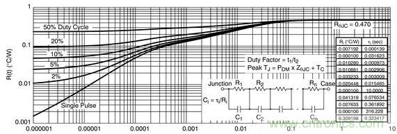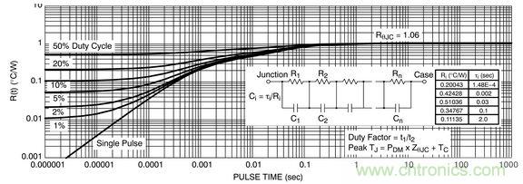 安森美半导体IGBT组件的数据表中包含IGBT及二极管θ值图表。稳态θ值如图7及图8中的图表所示。IGBT的θ值为0.470 °C/W,二极管为1.06 °C/W。计算中还要求另一项热系数,即两个裸片之间的热交互影响常数ψ。测试显示对于TO-247、TO-220及类似封装而言,此常数约为0.15 °C/W,下面的示例中将使用此常数。