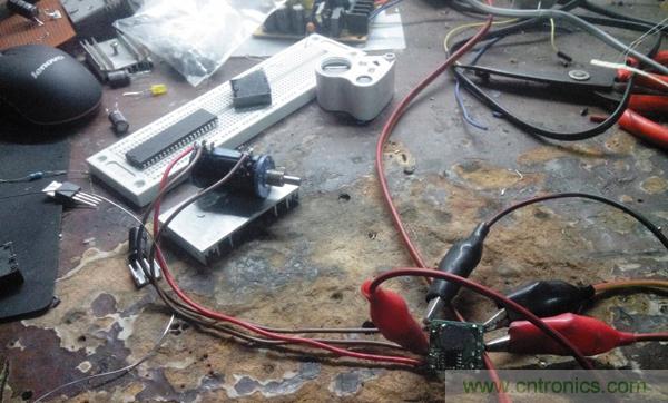 这会算是总装前测试了,两根白色线是??榈娜砥舳?,模块控制脚通过100k电阻到Vcc,所以悬空都能使??楣ぷ?,要让它停止输出,直接接地就好了,所以两根线怎么接,甭说了吧,都懂得。