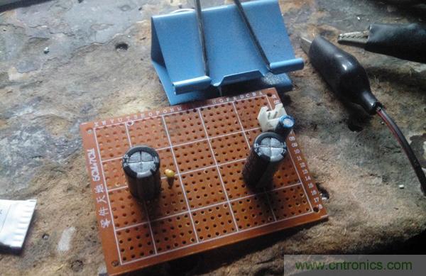 输入输出滤波电容以及稳压块输出插座焊接好,也有一只220uF的小电容做滤波,蓝色燕尾夹是固定稳压块和散热片,用的导热胶粘上去,发现要是完全固化了,抠都抠不下来。