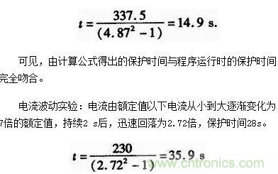 程序实现:根据行业标准,考虑热量积累快慢不同,散热速度不同,结合实际及现场的通风散热,经反复计算和测试,调整数学模型中参数C,最终为提高电机的反时限过流保护精度,确定采用: