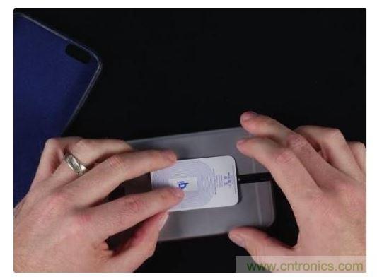 3、接下来的任务就是将接收器的金属触电与智能手机电池连接了,这是整个过程中最有难度的部分。不过只要细心,保证每一个金属触电都连接到一起就可以弄好。调整好位置后,将??樘降绯厣?;
