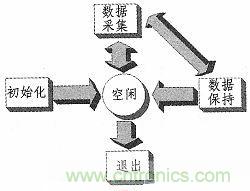 系统有初始化、空闲、运行、保持及退出5个状态。其状态转换如图1所示。系统启动时进入初始化状态,加载上次用户的设置参数后进入空闲状态,等待用户的按钮操作。在空闲状态下系统的辅助功能“数据管理”与“故障诊断”可以使用,同时可以配置用户参数??障凶刺碌慊?ldquo;运行”按钮,进入运行状态,这时数据采集卡开始采集数据,系统处理计算后显示在窗口中。运行状态下点击“停止”,系统返回到空闲状态。如果点击“保持”状态,这时系统停止采集,可以进行数据保存操作,保存停止采集前一时刻的所有数据和设置。系统后台进一步可对保存的数据进行计算分析。