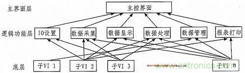 我们采用自顶向下的设计方式,将系统分为3层:主界面层、逻辑功能层和底层。“主界面层”主要包括主人机界面和系统总体控制。“逻辑功能层”负责系统的各种逻辑功能,例如I/O设置、数据采集、数据处理、数据管理和数据查询等。“底层”则是一个个按照基本功能划分子VI,供给高层次VI调用。采用调用子VI的形式来实现??橹涞牡饔煤凸亓?。当调用子VI时,系统需要花费很少的开销,大概几十毫秒的时间。测试系统的软件层次结构图3所示。