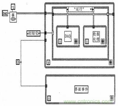 图4是测试系统软件的总体架构。其主要要点是:用while循环实现系统状态机,用事件结构监控界面按钮事件(用户点击各种按钮)和用户自定义事件,上述2者用事件进行同步,在状态机的“运行子状态”中,用队列同步数据采集和数据处理显示。