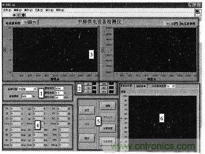 如图5所示,测试系统软件用户界面共分为6个部分:1)为检测对象选择控件;2)为电压、电流波形图显示通道选择控件;3)为电压、电流波形图显示;4)为电压、电流、功率等电能质量分析显示;5)为软件控制菜单控件;6)为谐波分析显示。