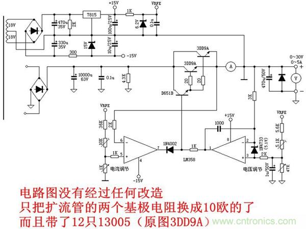 一般电源都用2N3055扩流,可是我要是用的话3055得现买刚好查资料13005也可以做扩流,而且手头又有一大批电子镇流器,基本上都是一批下来的,刚好参数也差不多就废物利用了,整个电源改造没花一分钱就是耗时,估计得四天以上。