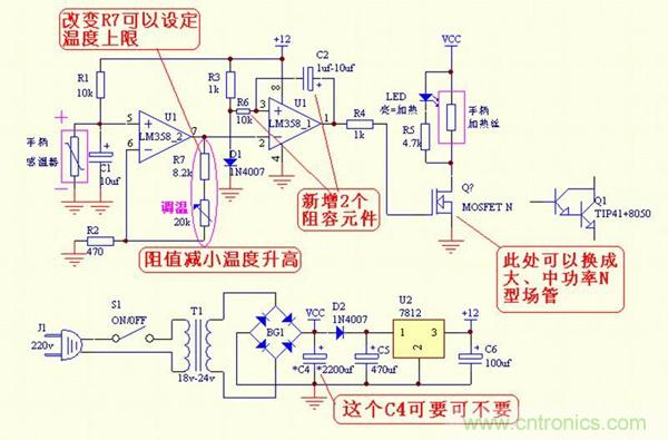 358运放,我用的是贴片式的,一共只找到两个。另一个做焊台了,那个是直插的,顺便把焊台的电路图也上传,焊台的C4我是加的。