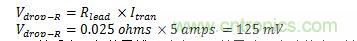 以一个具有25A供电,伴有5A瞬变电流的负载应用为例。其中,电源电压设为 2.5V,通过5英尺长的14AWG布线连接至IC测试板。由于是低电压供电,如果电压有超过100mV的跌落,通常是不可接受的。14AWG线每英尺的电阻为2.5mΩ,由此,在电源输出和IC测试板之间的导线回路存在25mΩ电阻。根据欧姆定律,我们可以计算出导向回路上可能出现的压降: