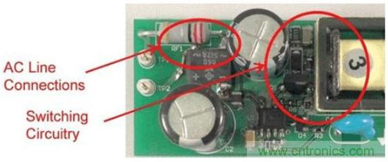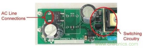 图1是这些非计划中电容的一个实例。图中的右侧是一个垂直安装的FET,所带的开关节点与钳位电路延伸至了图片的顶部。输入连接从左侧进入,到达距漏极连接1cm以内的位置。这就是故障点,在这里FET的开关电压波形可以绕过EMI滤波器耦合至输入。
