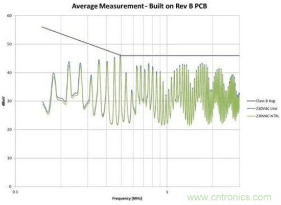 图4是修改后的效果图。我们在故障点位置为EMI规范获得了大约6dB的裕量。此外,我们还显着减少了总体EMI签名。所有这些改善都仅仅是因为布局的调整,并未改变电路。如果您的电路具有高电压开关并使用了屏蔽距离,您需要非常小心地对其进行控制。