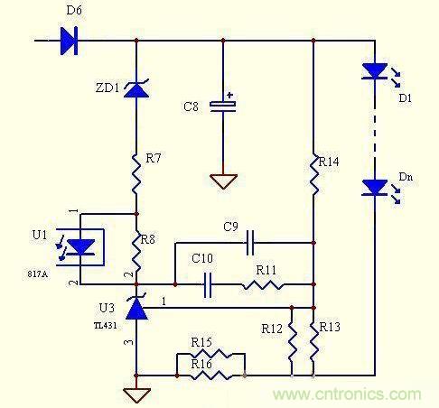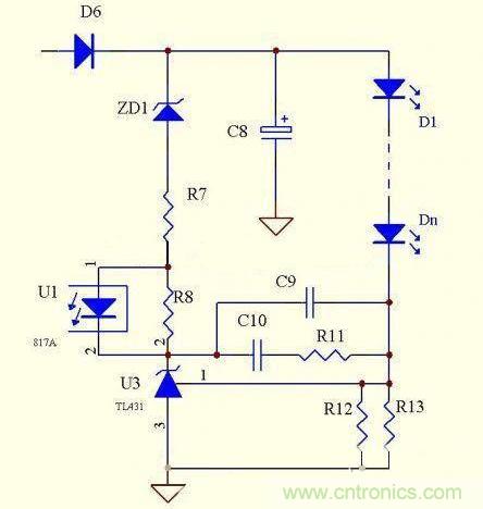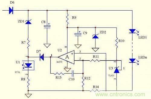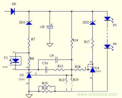 优点:电路简单,元器件少,成本低,跟上面电路相比,显着降低了取样电阻的功耗,恒流精度很高,克服了上面的电路不能空载的致命缺陷,当有个别LED击穿时,可以自动调整输出电压。