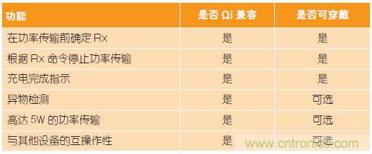 大多数Qi兼容功能的使用并不影响尺寸或性能。异物检测(FOD)功能是一项可选功能,可防止功率传输到充电区的杂散金属物体。在具有FOD功能的低功耗系统中,总输出功率被减小50%以上。随着充电区域的缩小,物体进入该区域,并被加热至出现问题的可能性也大大降低。FOD功能的关键可能主要取决于可穿戴设备充电垫或充电底座的机械设计。表1总结了采用WPC-1.1 Qi标准时的一些主要可用功能,而这些功能在定制可穿戴应用时是可选的。