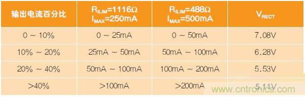 该器件系列具有动态整流器控制功能以改善负载瞬态特性(表2)。Qi标准有一个相对缓慢的全局反馈回路,最多可能需要100ms的时间来改变工作点。这意味着负载阶跃会降低输出电压并引起系统复位。为了提供足够的电压应对瞬态变化,在低负载时需要把VRECT工作点设高。该特性有助于负载阶跃,但会降低轻载效率。为解决这个问题,用动态效率调节功能来调节轻载电压,以适应最大输出负载。此外,还用一个电阻器来设定最大输出电流。