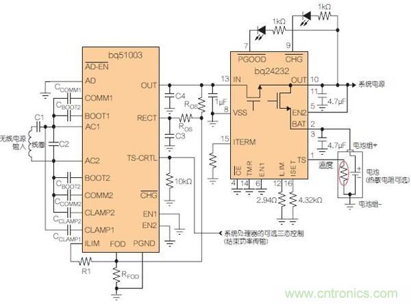 图4:适合低功耗应用的无线电源接收器(带电池充电器)