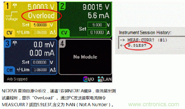 设定N6781A源表??榈牡缌髁砍?mA,然后控制输出电流超过1mA。此时,显示屏上直接显示“OverLoad”,而不是电流的数值。如果通过PC发送读取电流指令,你会读到9.91E37,这个数值9.91E37在SCPI(仪表编程命令标准)中被定义为“NAN”(Not A Number)。所有是德科技的测试仪表都是遵循SCPI标准的,当实际值超出量程时,电源返回9.91E37。NAN(9.91E37)实际代表一个32bit浮点数,在所有测量仪表中预计都不会出现这么大的数值。