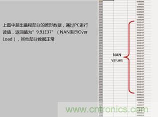 通过PC读取波形的数据,超出量程部分将返回”9.91E37”,如下图所示: