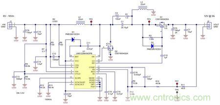 图3用LM5122同步升压型控制器实现了同步SEPIC转换器。它允许使用一个N通道的金属氧化物半导体场效应晶体管(MOSFET)(Q1)来替换二极管D1,从而能降低损耗或在损耗相同的情况下允许更多的输出电流。