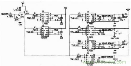 选用东芝半导体公司生产的高速光耦隔离型IGBT/MOSFET驱动芯片TLP250.TLP250具有隔离电压高、驱动能力强、开关速度快等特点。驱动电路的原理图如图3所示。