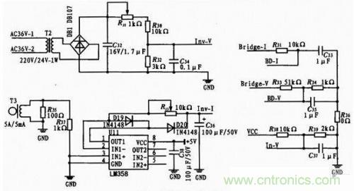 输出电压采样用于反馈稳压,输出电流采样用于过载保护,母线电流采样用于短路?;ぃ赶叩缪共裳糜谙拗颇赶叩缪剐楦?,输入电压采样用于输入过压/欠压?;?。输出采样中使用了电流互感器与电压互感器,大大减小了系统干扰,提高了系统的可靠性。取样电路的原理图如图4所示。