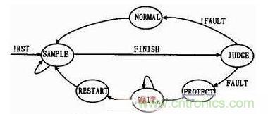 为了提高系统的可读性以及代码效率,软件采用状态机思想设计,图5所示为系统的状态转换图。系统上电复位后进入SAMPLE采样状态,若检测到采样完成标志FINISH则进入JUDGE状态进行判断,如果FAULT不为0即有故障信号(过压/欠压、过载、短路),则进入PROTECT状态关闭输出,并跳转到WAIT状态等待故障信号消除。当故障信号消除后,系统软重启,开始新的采样及检测。JUDGE状态后如果未检测到故障信号,则进入NORMAL正常状态,进行电压调整。