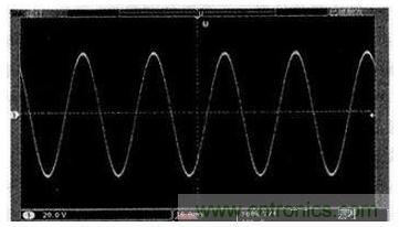 根据以上思想试制一台400 W的样机,采用IRF3205作为推挽升压的功率管,HER307作为整流二极管,全桥逆变功率管则采用IRF840.前级升压的PWM波频率设置为20 kHz,后级SPWM波的频率设置为18 kHz,输出滤波电感L为1 mH,输出滤波电容C为4.7μF.实际测试正弦交流输出电压精度为220 V±1%,频率精度为50 Hz±0.1%,THD小于1.5%,逆变效率大于87%,其满负载时的试验波形如图7所示(输出经20 kΩ/100 kΩ电阻分压测到)。