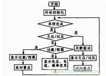 系统上电后,首先完成各个外设的初始化,主要包括系统时钟、定时器、GPIO口、ADC、DMA、中断及SPI的初始化。在此,定时器和中断一旦初始化完成,PWM及SPWM波就会生成。考虑到过流、短路?;ぜ胺蠢∥妊沟氖凳毙砸蠼细?,故在中断内完成。欠压、过压对实时性要求低,放在主程序内。为提升系统的性能,ADC采样使用DMA方式传输数据,传输完成后,发出中断申请,对采集到的数据进行简单滤波处理,其他功能函数调用此数据完成相应的?;ぜ拔妊构δ堋V鞒绦虻牧鞒掏既缤?所示。