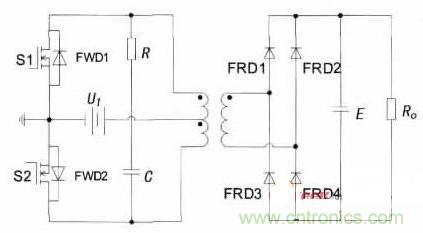 当S1开通时,其漏源电压uDS1只是一个开关管的导通压降,在理想情况下可假定uDS1=0,而此时由于在绕组中会产生一个感应电压,并且根据变压器初级绕组的同名端关系,该感应电压也会叠加到关断的S2上,从而使S2在关断时承受的电压是输入电压与感应电压之和约为2UI.在实际中,变压器的漏感会产生很大的尖峰电压加在S2两端,从而引起大的关断损耗,变换器的效率因受变压器漏感的限制,不是很高。在S1和S2的漏极之间接上RC缓冲电路,也称为吸收电路,用来抑制尖峰电压的产生。并且为了给能量回馈提供反馈回路,在S1和S2两端都反并联上续流二极管FWD.