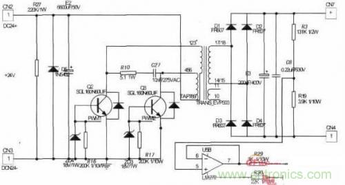 图5为简化后的主电路。输入24V直流电压,经过大电容滤波后,接到推挽变压器原边的中间抽头。变压器原边另外两个抽头分别接两个全控型开关器件IGBT,并在此之间加入RC吸收电路,构成推挽逆变电路。推挽变压器输出端经全桥整流,大电容滤波得到220V直流电压。并通过分压支路得到反馈电压信号UOUT.