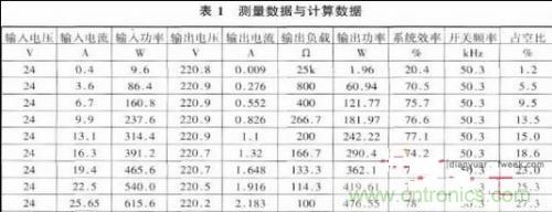 实验结果表面,输出电压稳定在220V,纹波电压较小。最大输出功率能达到近600W,系统效率基本稳定在80%,达到预期效果。如下表1所示。