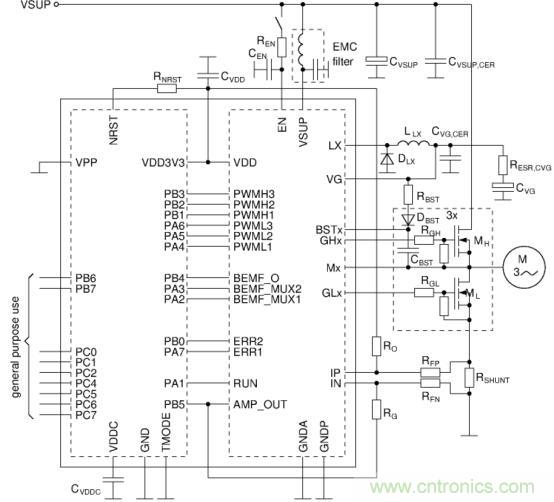 完善的内部集成功能使得PCB板级的设计变得简单,另外,其内置的BEMF测量模块,使得用户在测量相电压时无需使用外部分压电阻,进一步简化板级的设计。