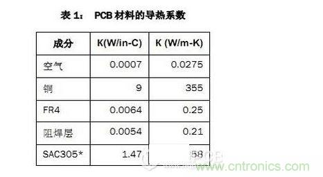 该PCB主要由FR4电路板材料和铜组成,另有少量焊料、镍和金。表1列出了主要材料的导热系数。
