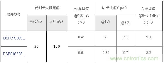 图4:东芝肖特基二极管DSF01S30SL和DSR01S30SL的主要规格