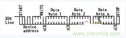 如果主设备要向EEPROM中写数据,在地址字节中主设备向EEPROM发出一个写请求(R/W=0),发送的地址字节之后紧跟着要发送的数据。每发送一个字节的数据后EEPROM就会产生一个应答信号,主设备也会监控应答信号,如果在发送一个字节后EEPROM没有返回应答信号,则主设备就会停止发送,并生成一个结束信号。写操作的时序如图3所示。