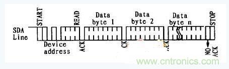 要从EEPROM中读取数据时,应设置R/W=1.在EEPROM发送完一个字节的数据后,主设备产生一个应答信号来响应,告知EEPROM主设备要求更多的数据,对应主设备产生的每个应答信号EEPROM将发送一个字节的数据。当主设备不发送应答信号并随后发送结束信号位时结束此操作。读操作的时序如图4所示。