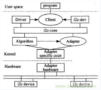 在图5中,一个Client对象对应一个具体的I2C总线设备,而一种I2C设备的Driver可以同时支持多个Client.每个Adapter对应一个具体的I2C总线控制器。不同的I2C总线控制器可以使用相同的算法Algorithm.i2c-core是I2C总线驱动程序体系结构的核心,在这个??橹校宋芟呱璞盖峁┝艘恍┩骋坏牡饔媒涌诶捶梦示咛宓淖芟咔绦蚬δ?,以进行读写或设置操作外,还提供了将各种支持的总线设备驱动和总线驱动添加到这个体系中的方法,以及当不再使用这些驱动时将其从体系中删除的方法。i2c-core将总线驱动程序体系一分为二,相互独立。可以针对某个I2C总线设备来设计一个I2C设备驱动程序,而不需要关心系统的I2C总线控制器是何种类型,所以提高了其可移植性。另一方面,在设计I2C总线驱动时也可以不要考虑其将用来支持何种设备。因为i2c-core提供了统一的接口,所以也为设计这两类驱动提供了方便。