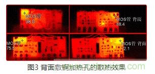 b) MOS管与背面的铜平面的温差大大减小,热孔的传热性能良好。