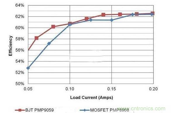 在低功耗(3W 及以下)反激式电源中,很难在成本上击败 BJT。大批量购买时,一个 13003 NPN 晶体管价格可低至 0.03 美元。该器件不仅可处理 700V VCE,而且无需过大的基流便可驱动几百毫安的电流。使用 BJT,增益和功率耗散可能会将实际使用限制在低功耗应用中。在这些低功耗标准下,MOSFET 与 BJT 之间的效率差异非常细微。下图 1 对比了两个相似 5V/1W 设计的效率。第一个设计是“230VAC 输入、5.5V/250mA 非隔离式反激转换器”使用 MOSFET,而另一个设计则是“120VAC 输入、5V/200mA 反激转换器”使用 BJT。这并不是完全公平的对比,因为这两个电源在设计上采用不同的输入电压运行,但它说明了它们的效率有多相似。