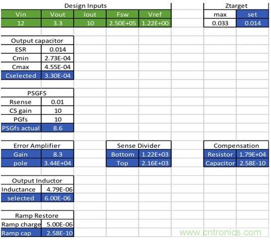 最小电容和最大电容限值也是计算出来的,而最终入选值还可供选择,选定值再用于剩下的计算。这些覆盖值也允许其它输入,包括PGFS和输出电感。重要的是,这些决定和选择要按此顺序进行。