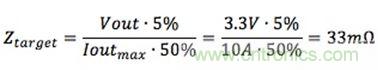 拿12V输入、3.3V/10A输出VRM要求作为例子,目标阻抗的计算公式是: