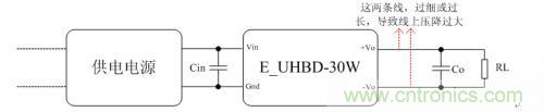 根据数据手册要求连接E2405UHBD-30W电源模块外围电路,负载使用电子负载仪加满载,供电电源使用可编程直流电源。模块上电,电子负载仪上显示的电压值不是5.0V,而是4.7V,然而在测量电源??槭涑鲆帕蕉说牡缪怪凳?.0V。什么原因呢?E2405UHBD-30W??槁厥?,输出电流有6A,而??橐诺礁涸匾嵌丝谥涞牧酉咛ち?,使得连接线的阻抗值大。如果阻抗为0.05欧姆,那么连接线上的电压差为0.05Ω*6A=0.3V,这个就是??槭涑鲆诺礁涸匾嵌丝诘难共?。